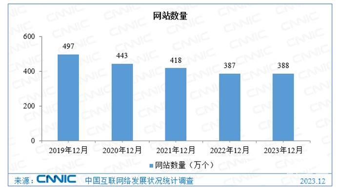 2024年03月22日中國互聯(lián)網(wǎng)信息中心發(fā)布了第53次《中國互聯(lián)網(wǎng)絡發(fā)展狀況統(tǒng)計報告》,報告顯示,截止2023年12月,我國網(wǎng)站數(shù)量為388萬個。