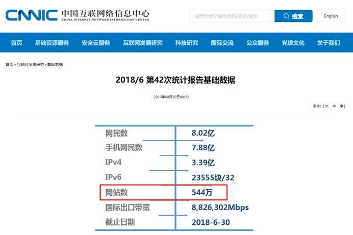 然而筆者看到2018年6月第42次互聯(lián)網(wǎng)發(fā)展統(tǒng)計報告的數(shù)據(jù)顯示的網(wǎng)站數(shù)量是544萬個。